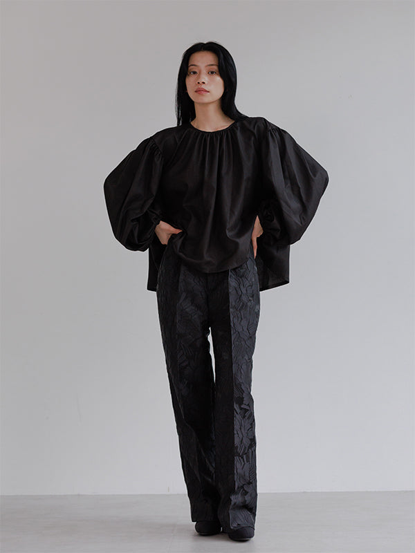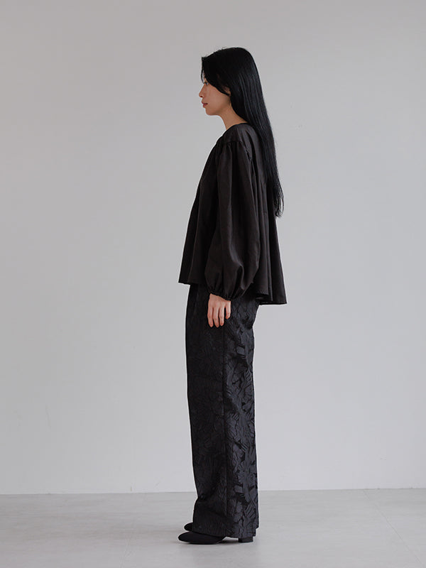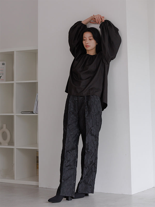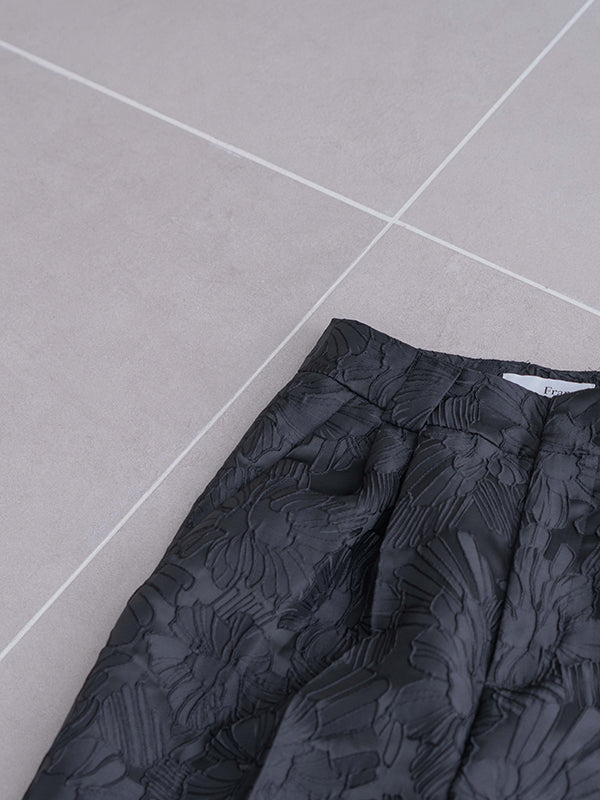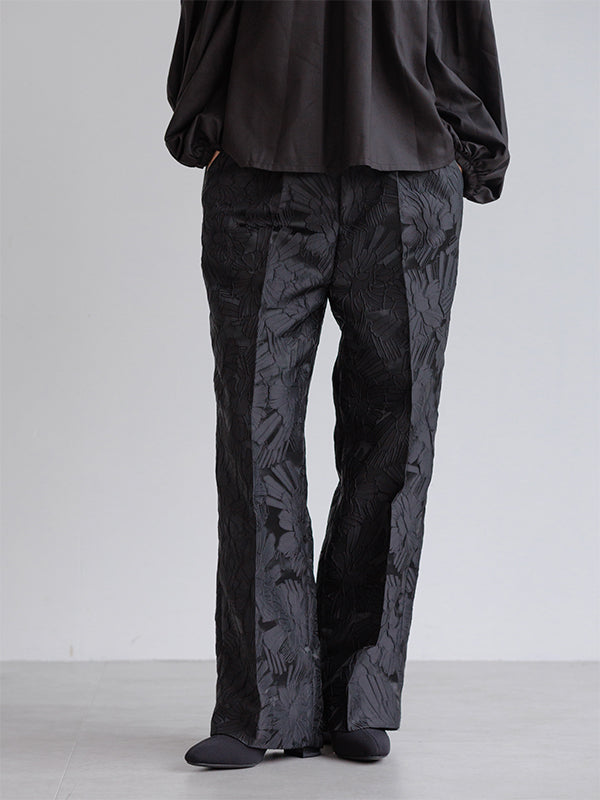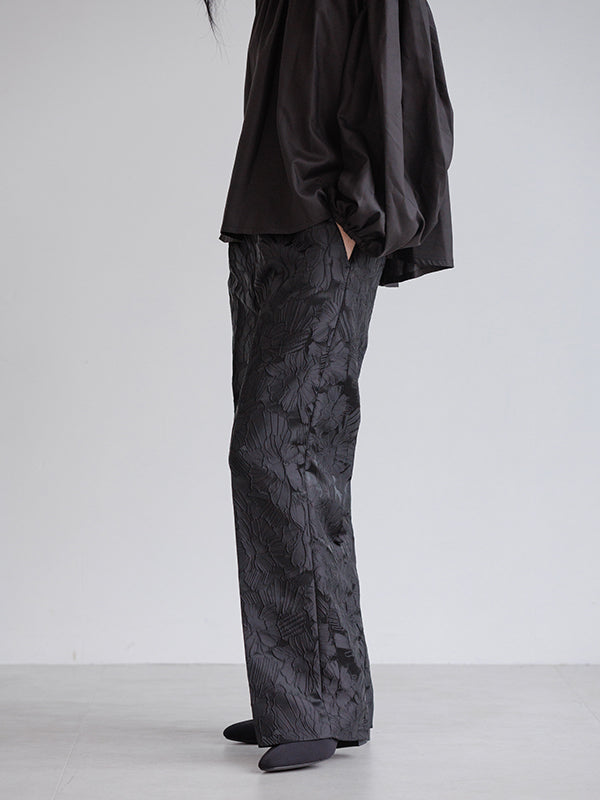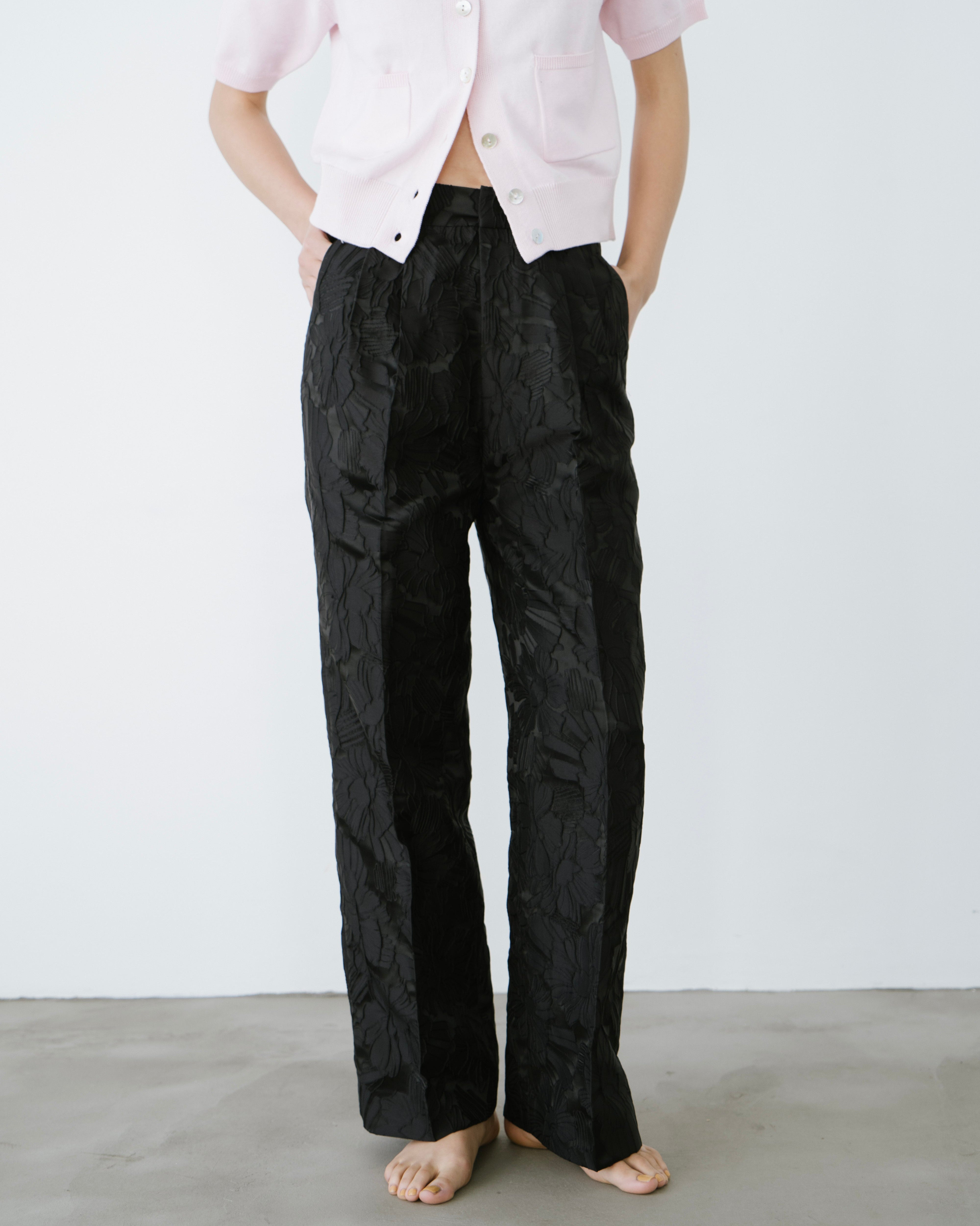 立体感ある花模様ジャカード素材で仕立てたハイウエストパンツ。