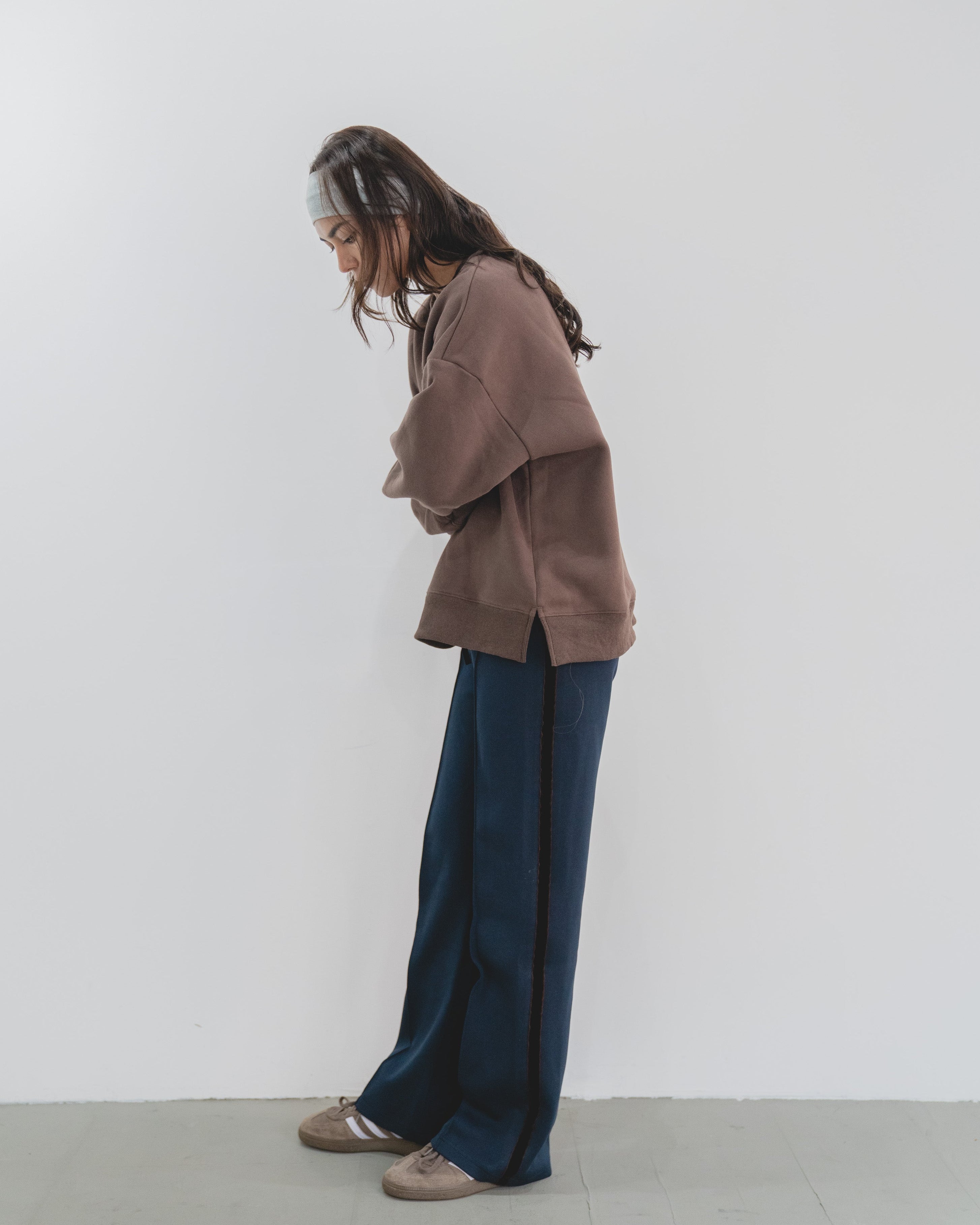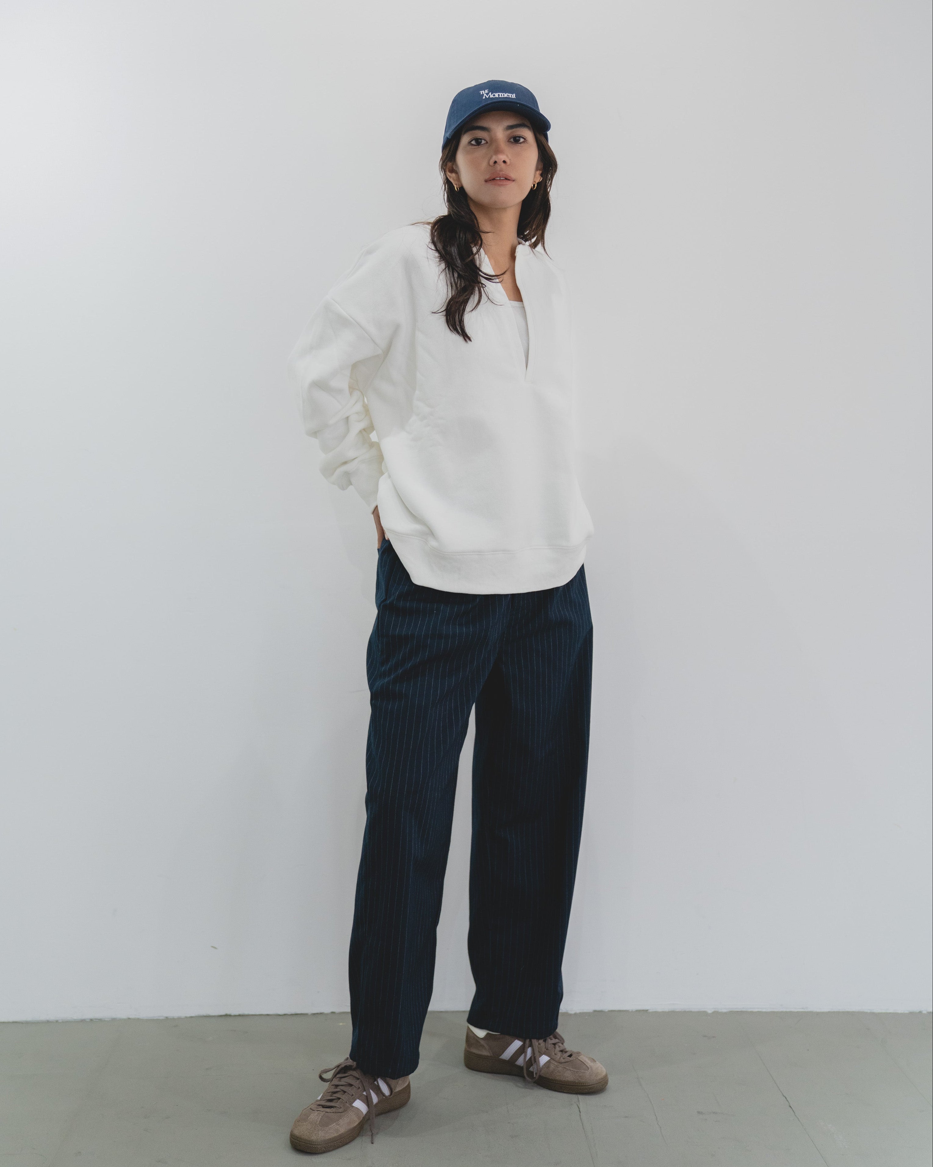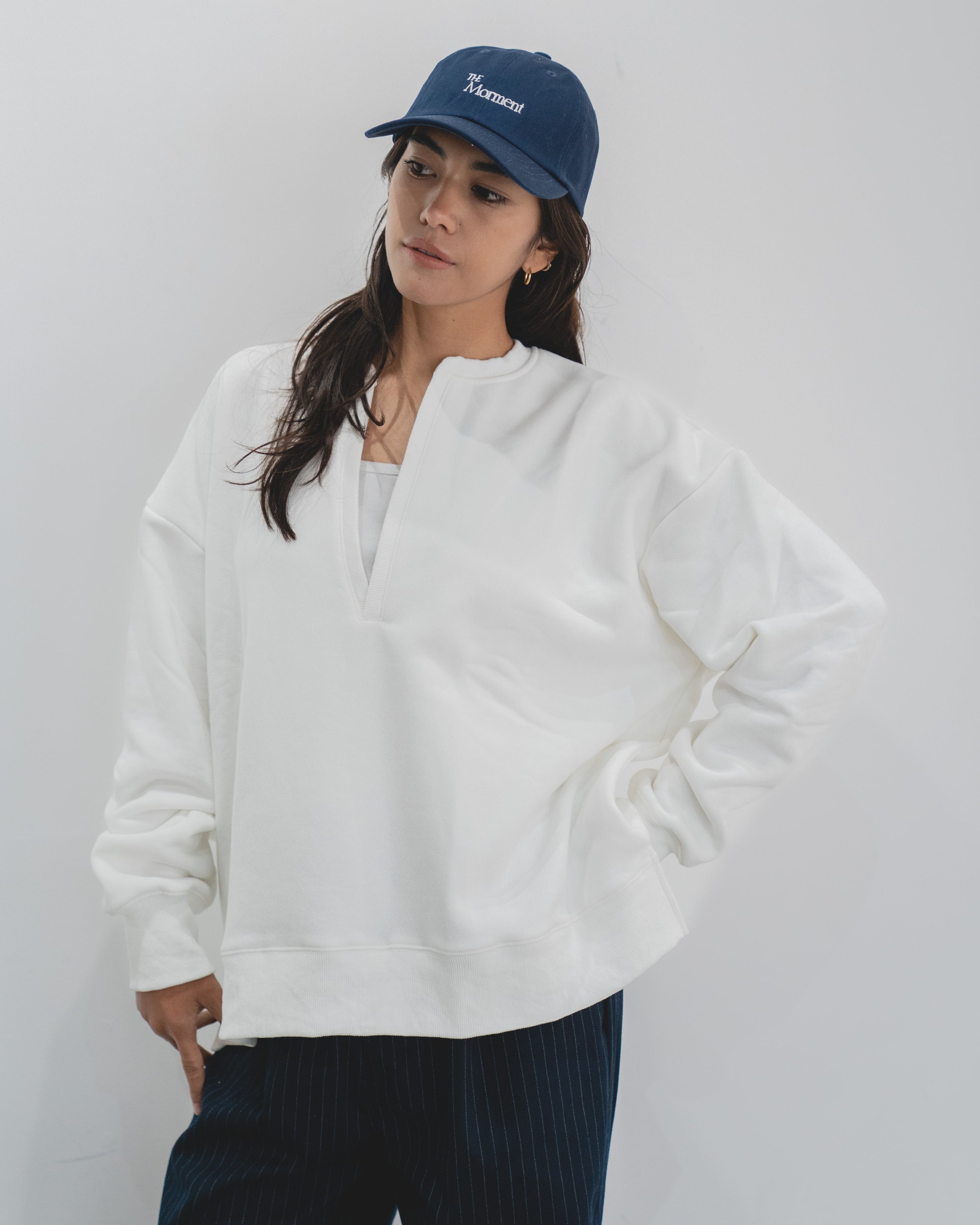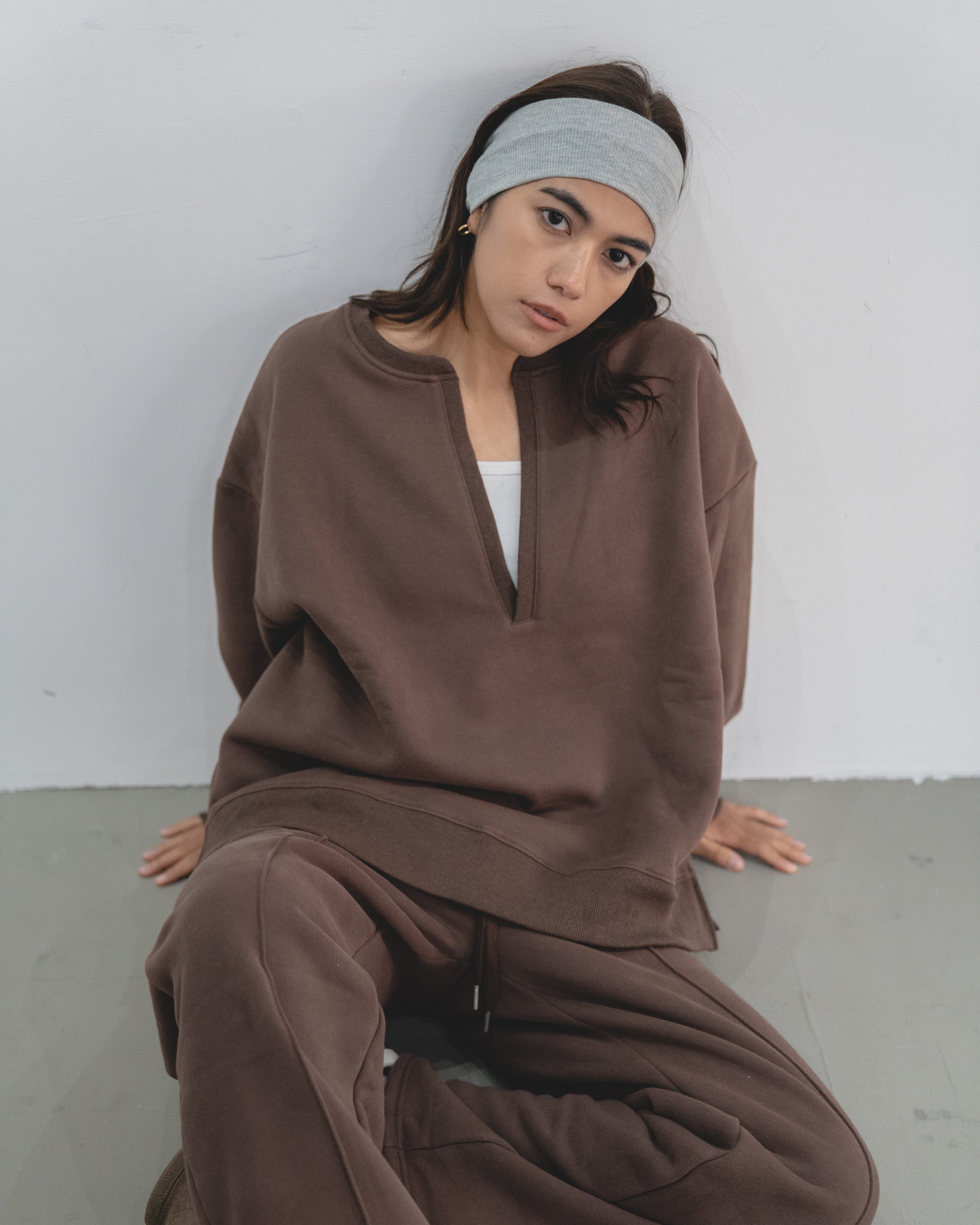 胸元のデザインがシンプルながらも洗練されていて、お出かけにも着たくなるようなスウェットトップスです。
