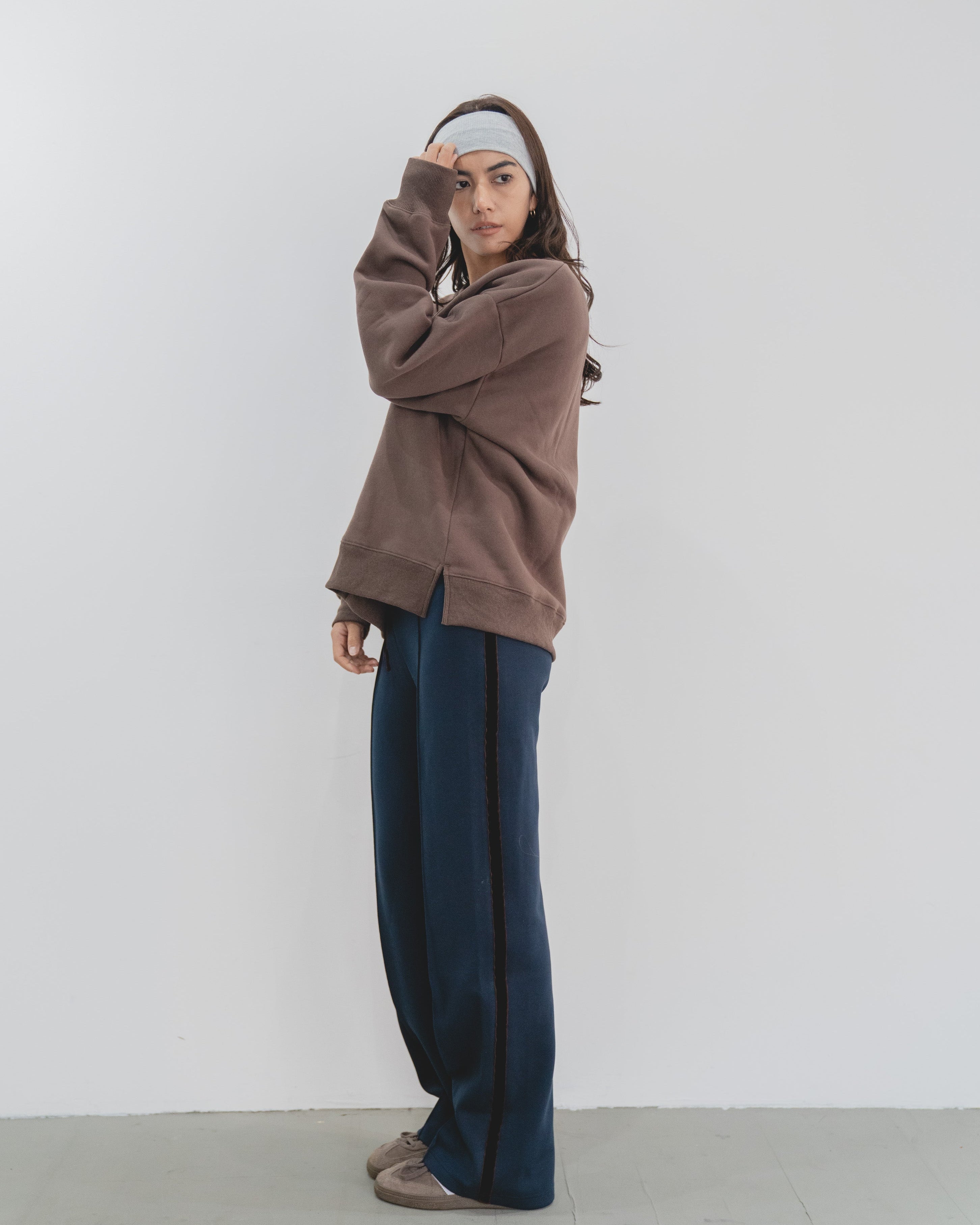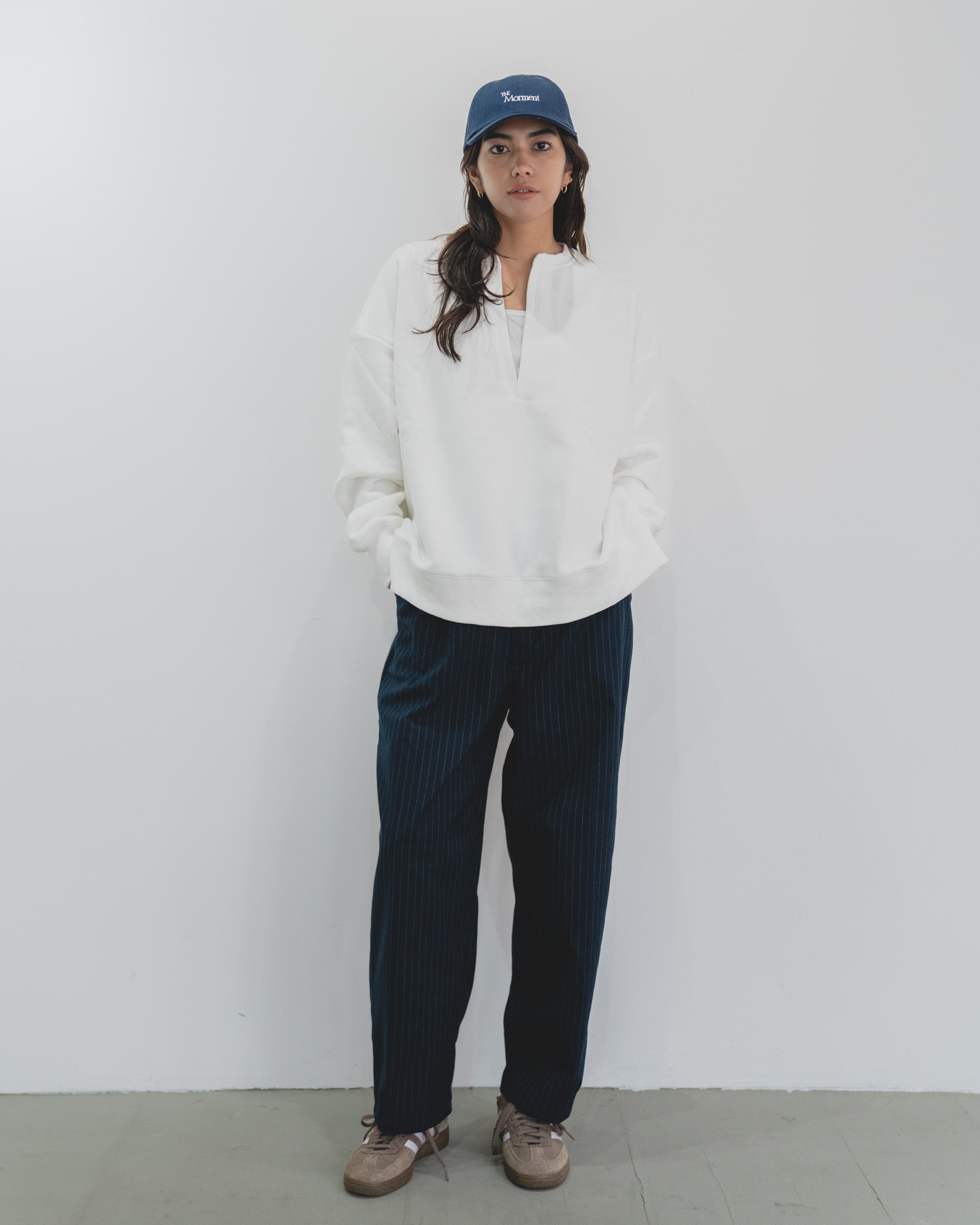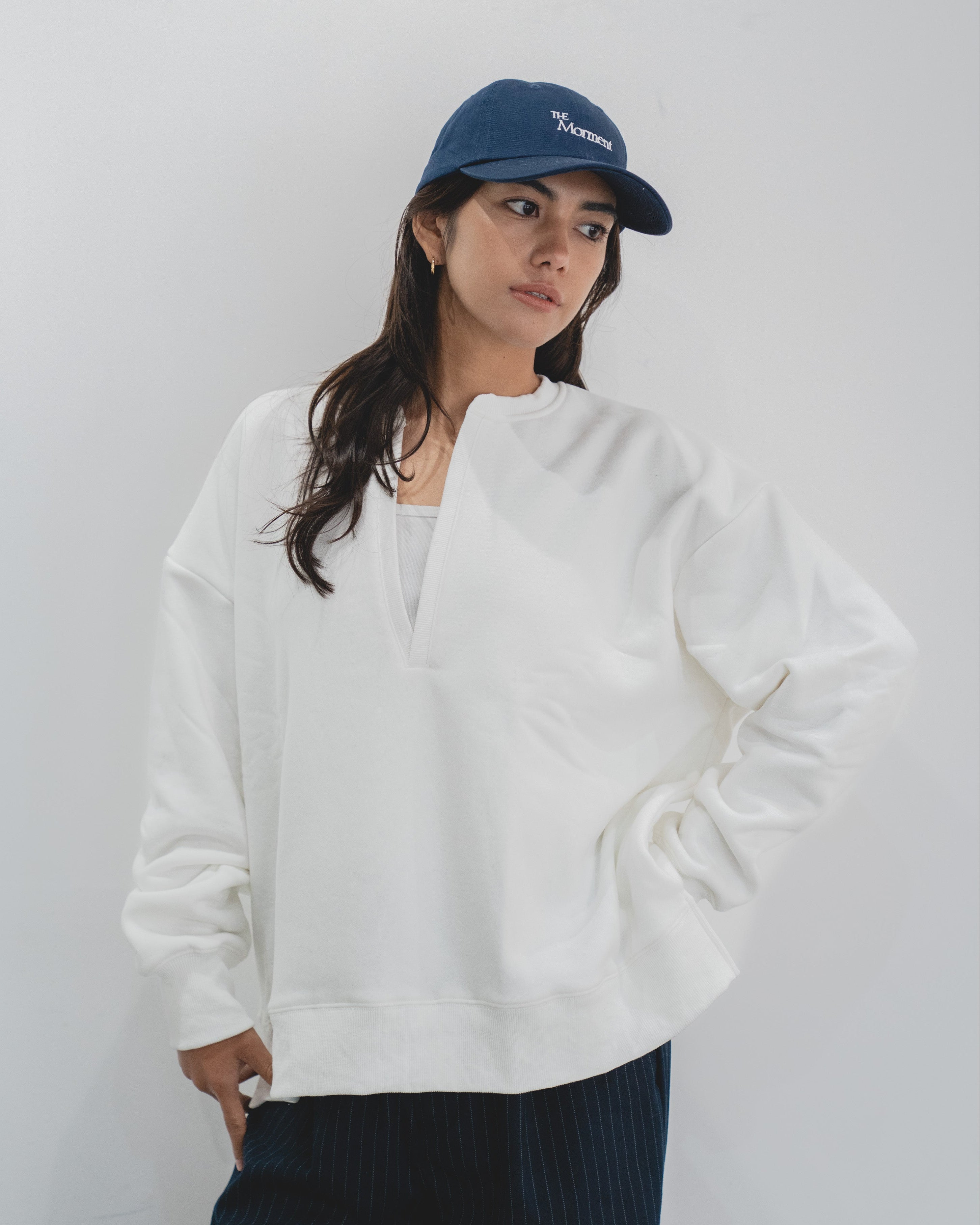胸元のデザインがシンプルながらも洗練されていて、お出かけにも着たくなるようなスウェットトップスです。
