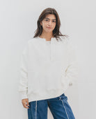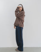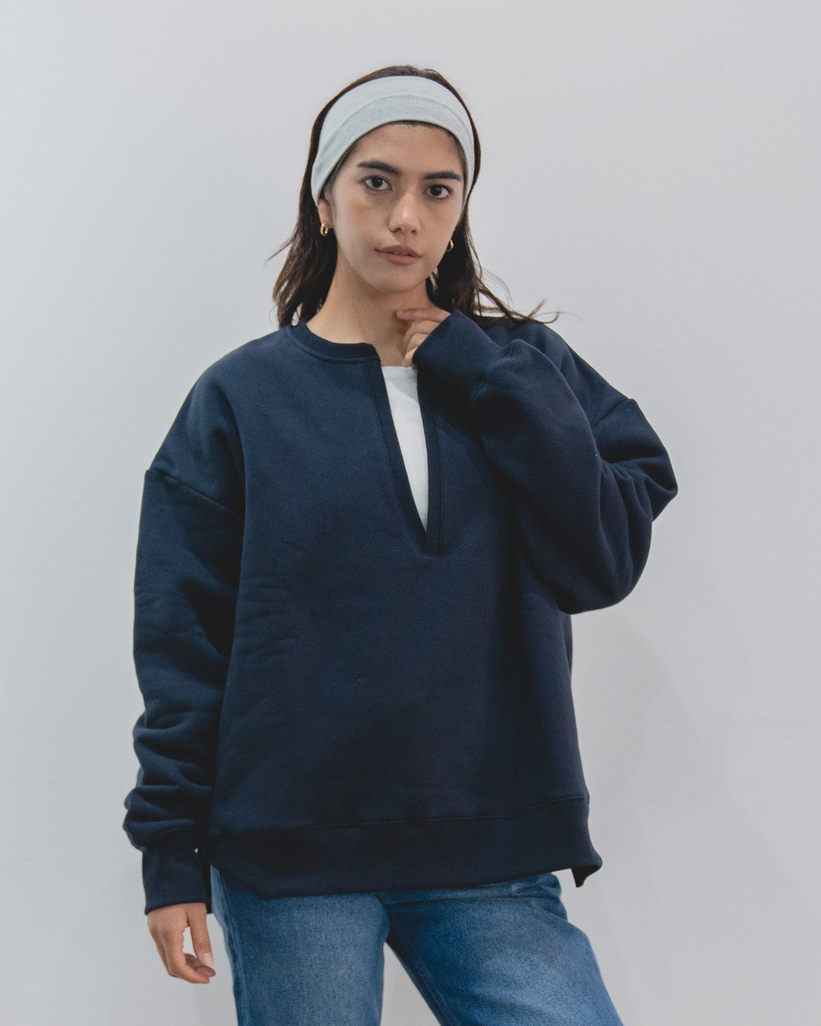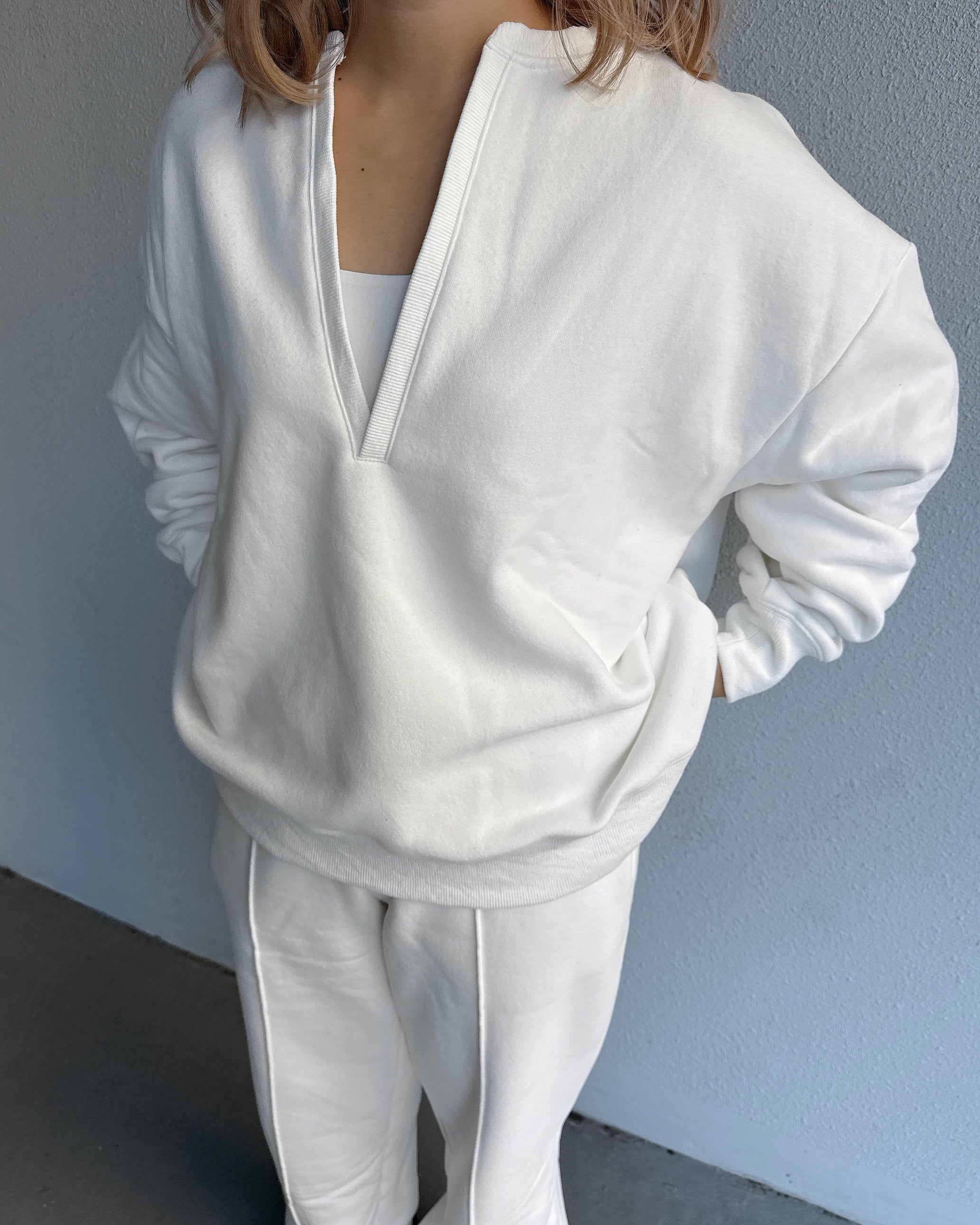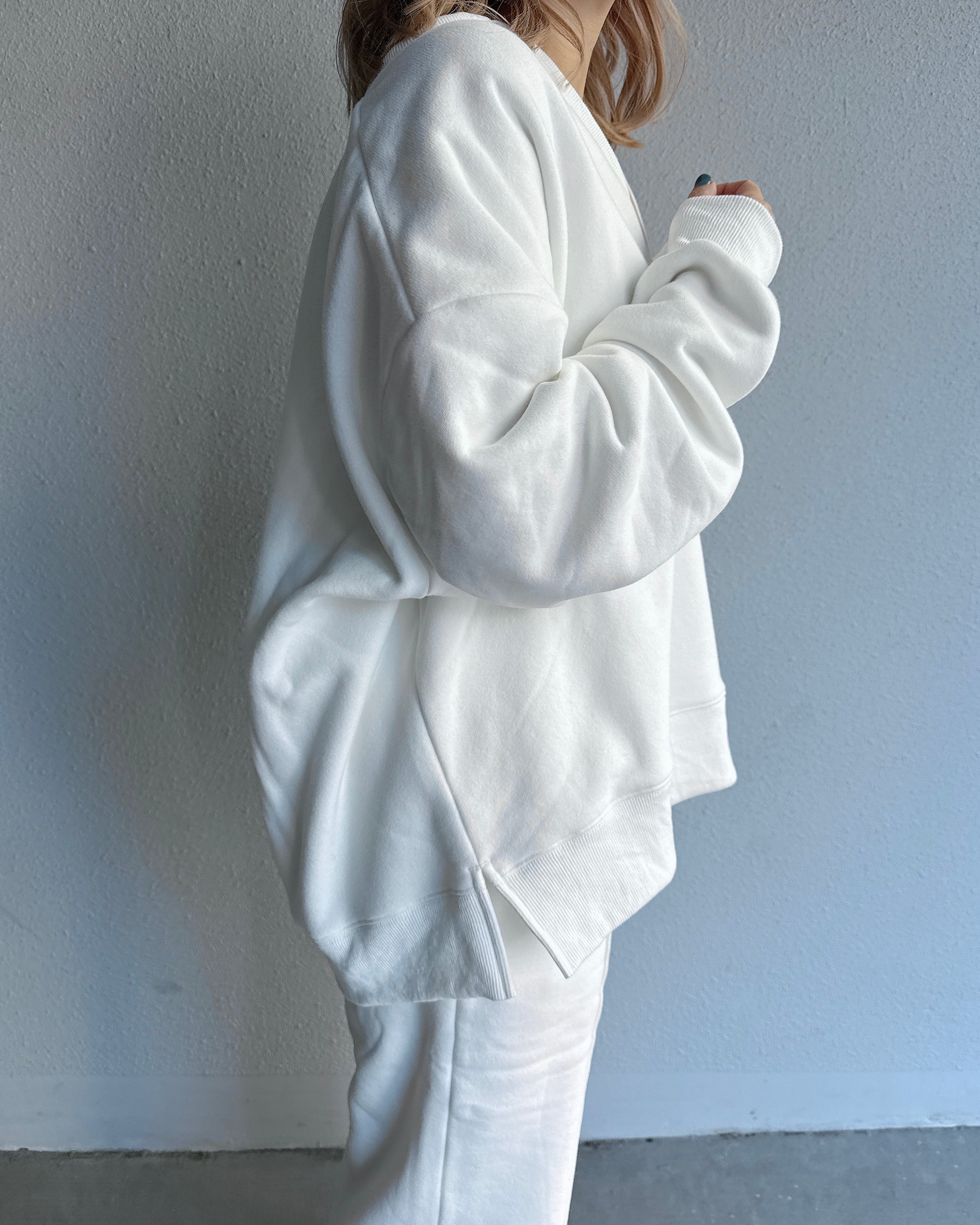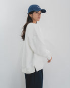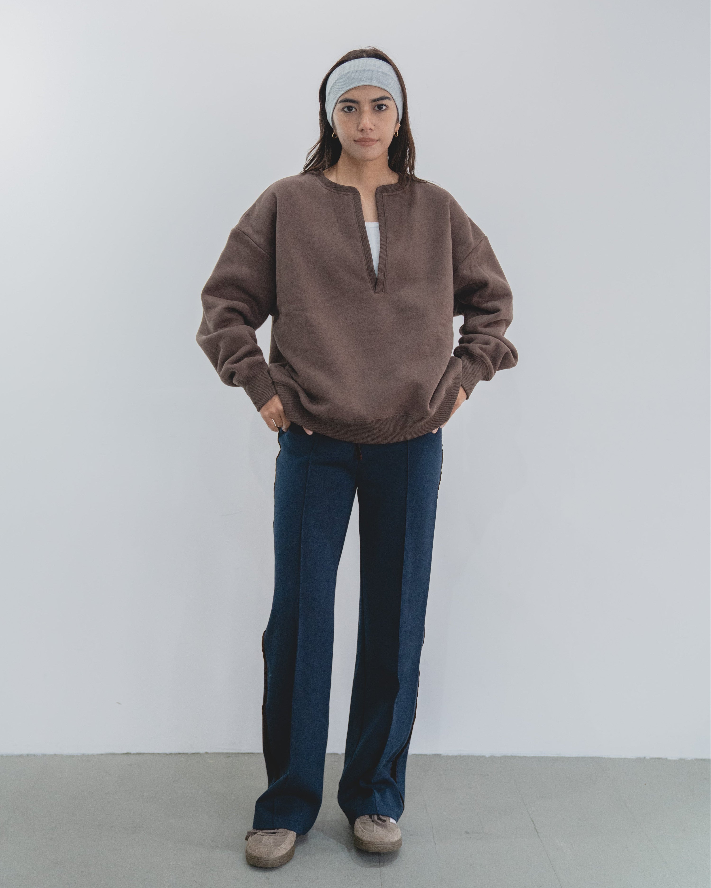 胸元のデザインがシンプルながらも洗練されていて、お出かけにも着たくなるようなスウェットトップスです。