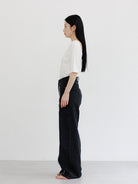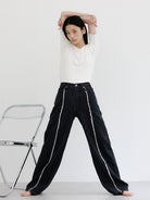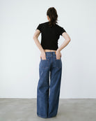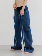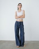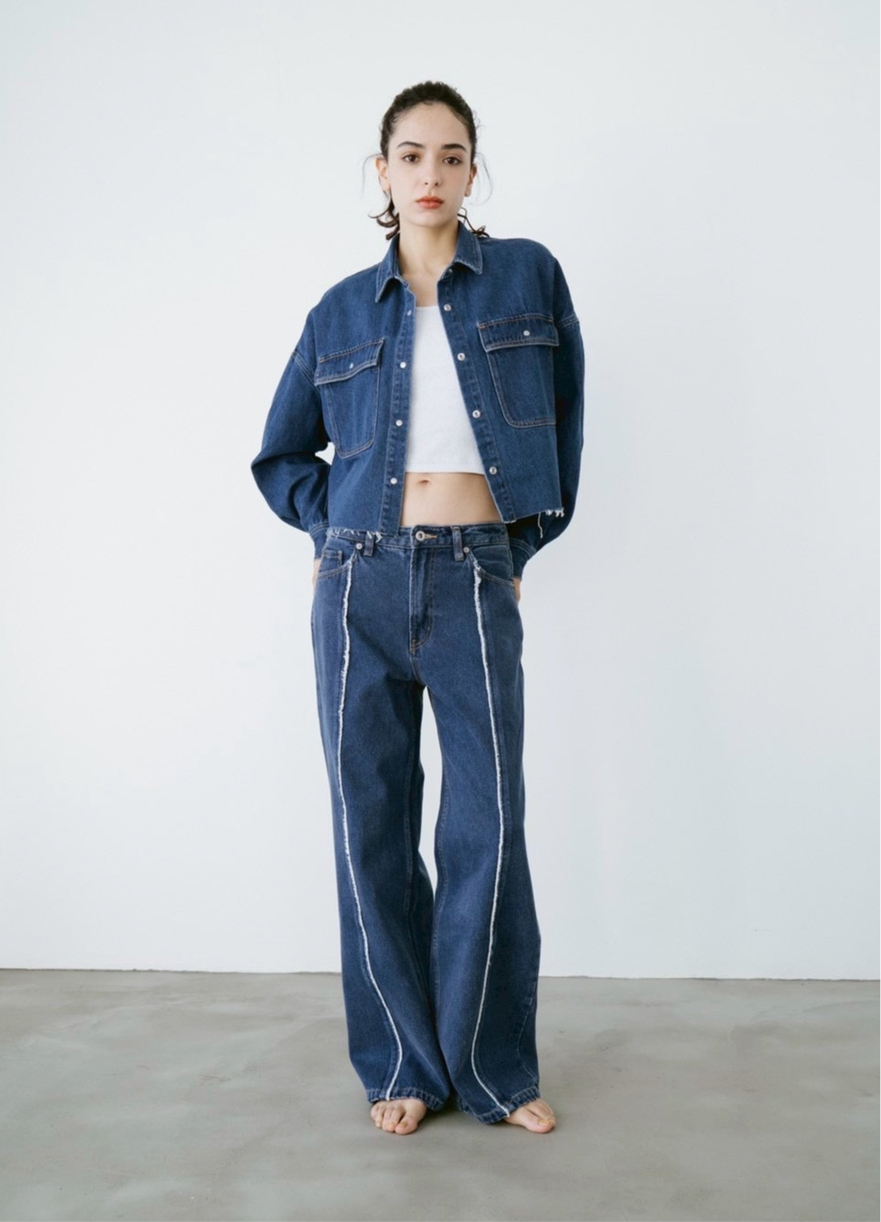 フロントはフリンジの切り替えデザインをプラス定番のデニムとは背別化され腰に落とし、緩く履くのもおすすめのスタイリングです。