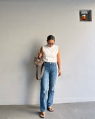 、加工感は控えめにキレイめスタイリングやカジュアルスタイリングでも着まわしやすいアイテムです。 ヒールやスニーカーでも足元もたつきが無いように裾幅を決めています。