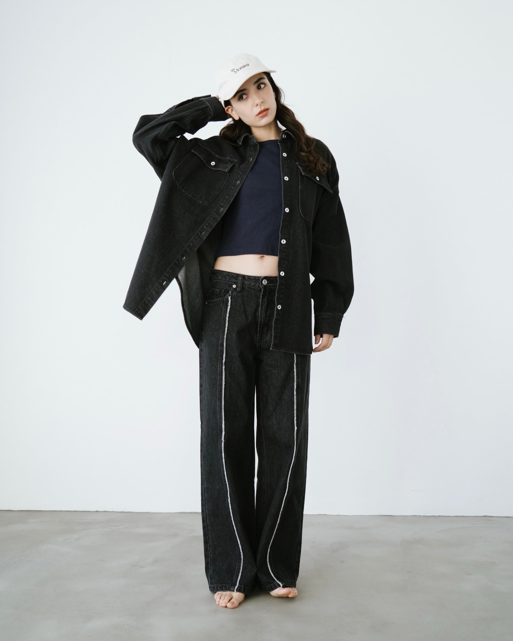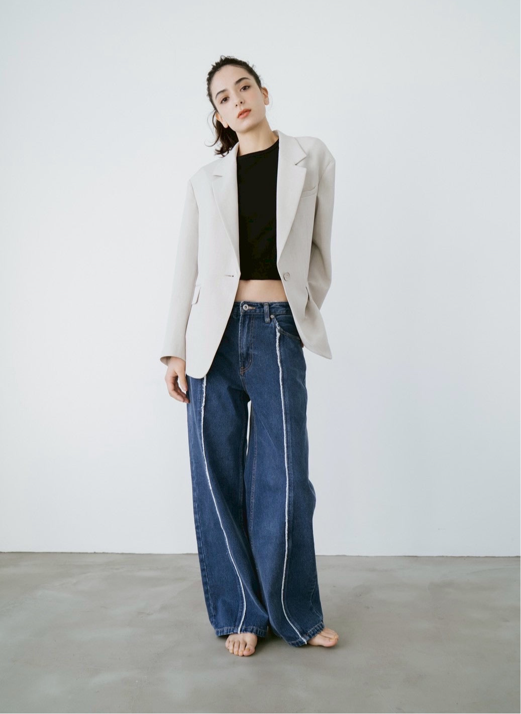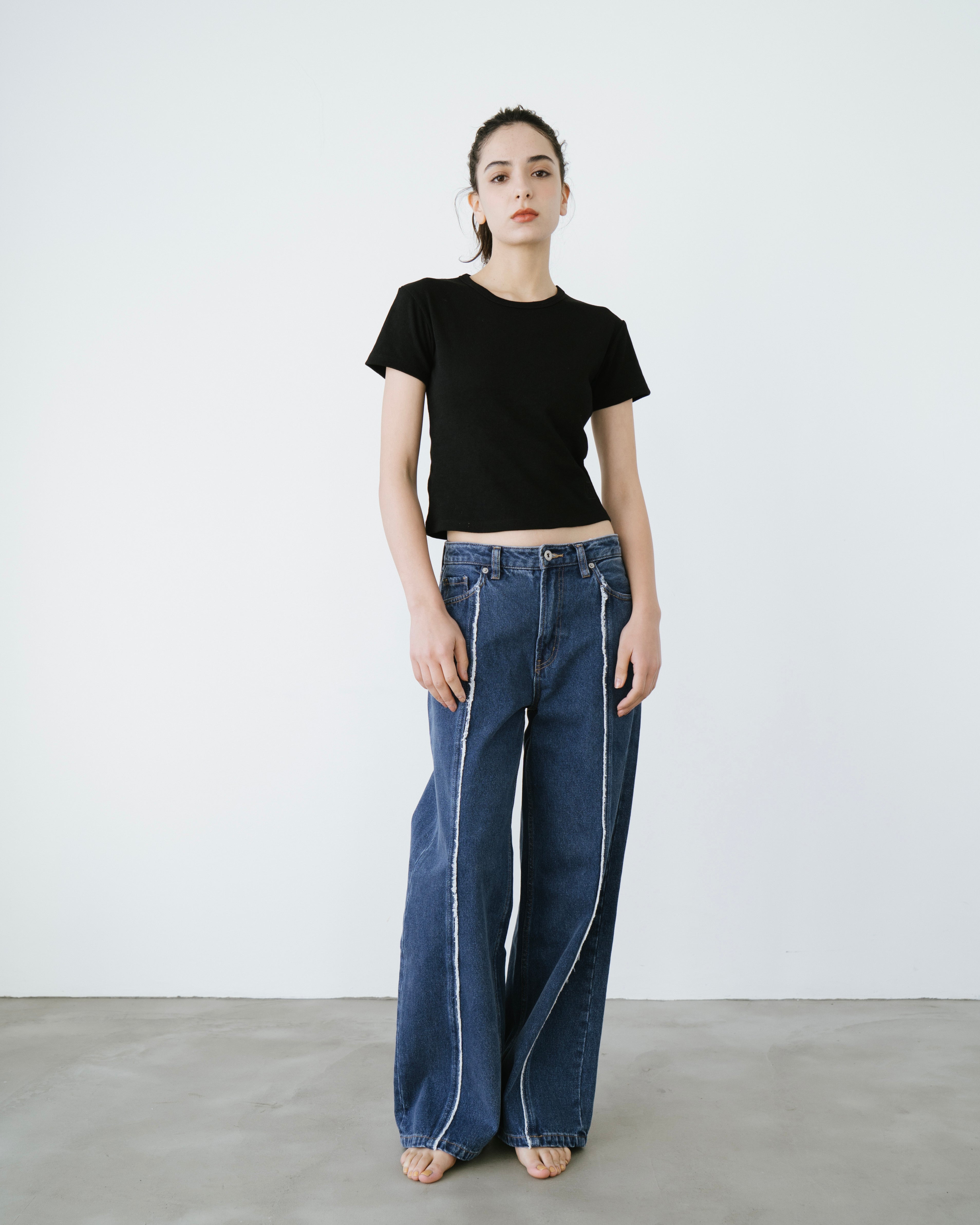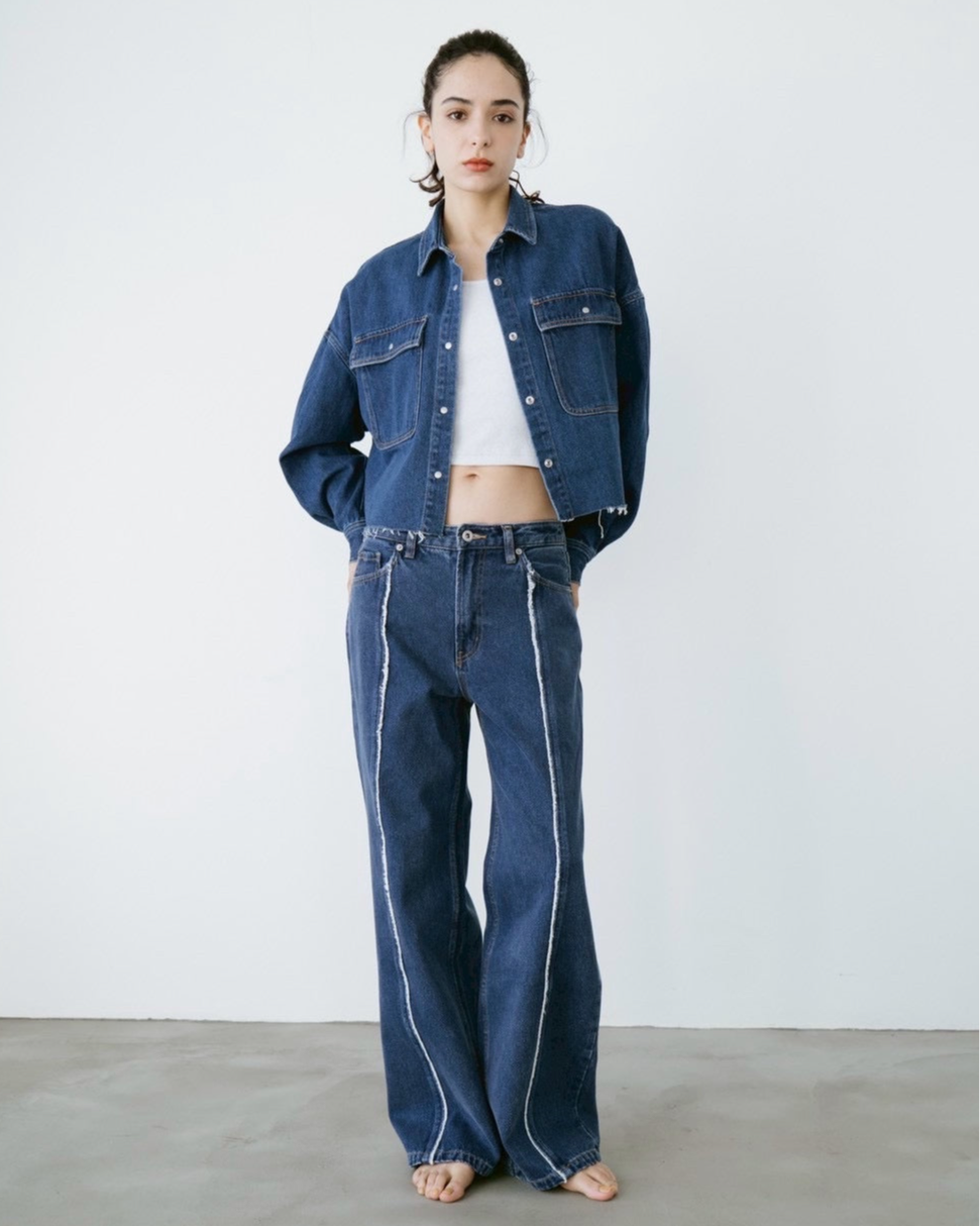 フロントはフリンジの切り替えデザインをプラス定番のデニムとは背別化され腰に落とし、緩く履くのもおすすめのスタイリングです。