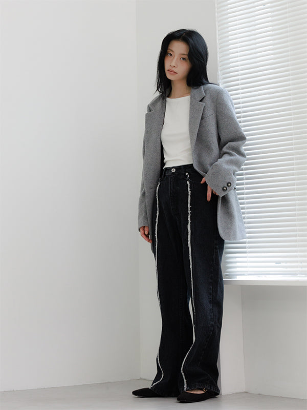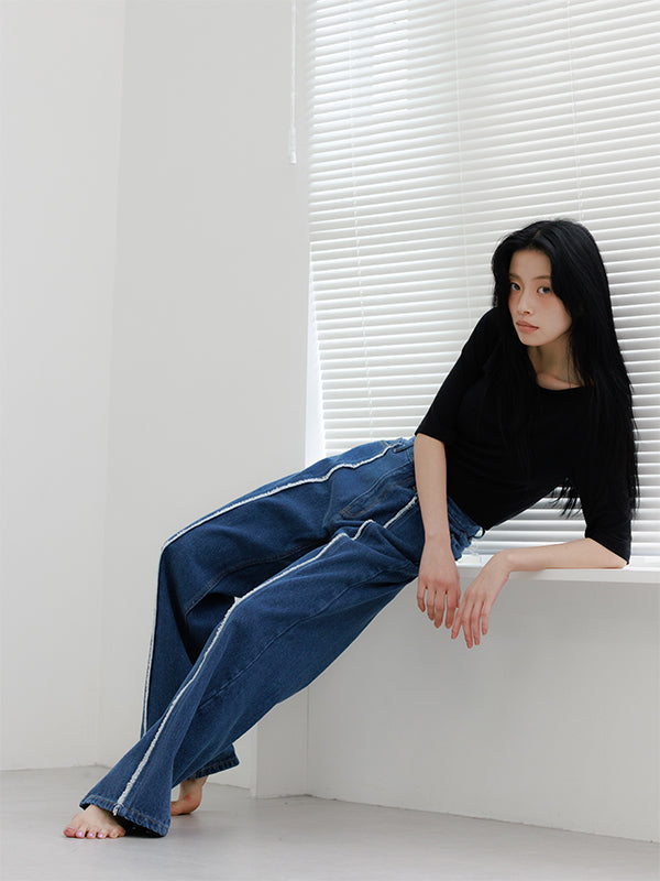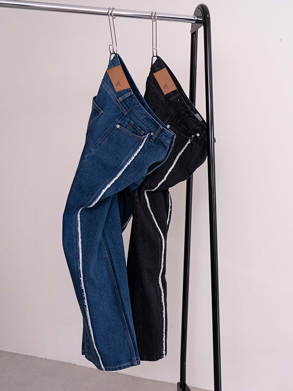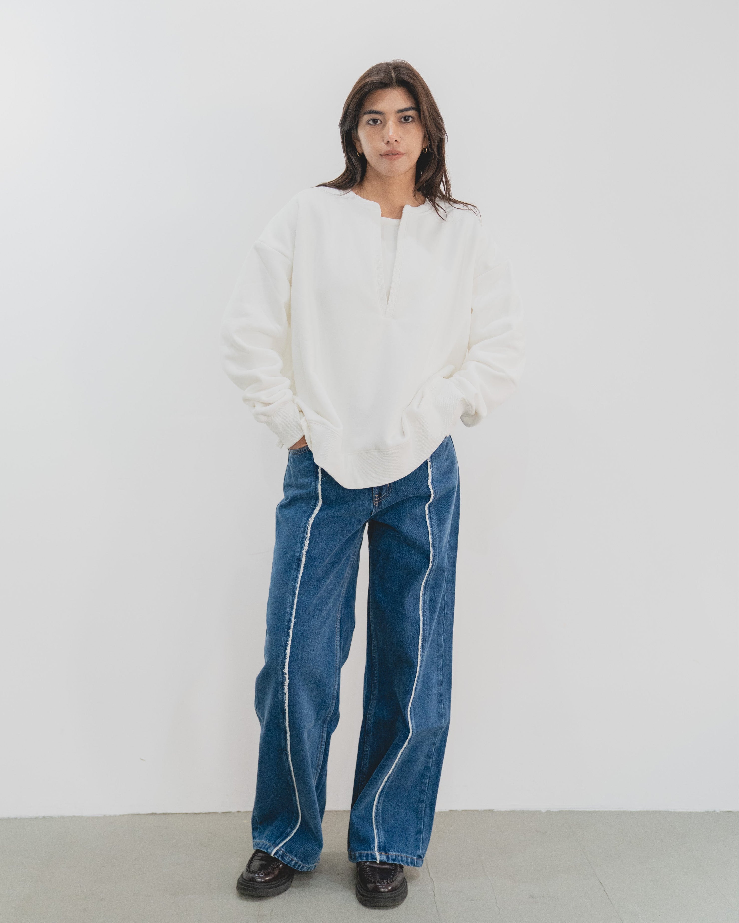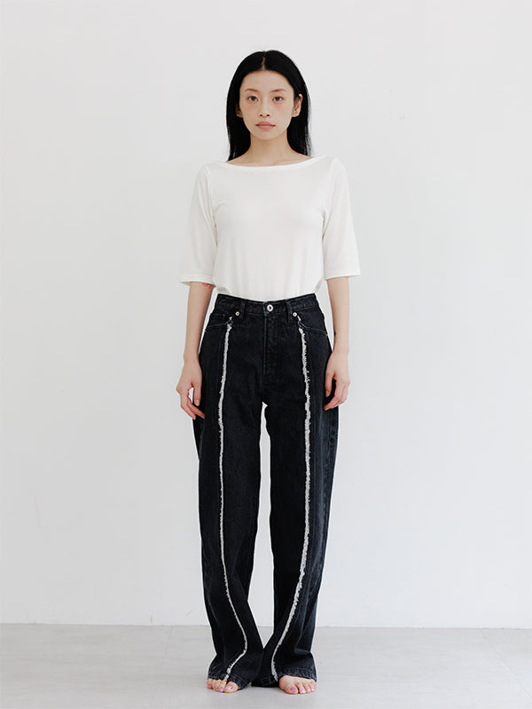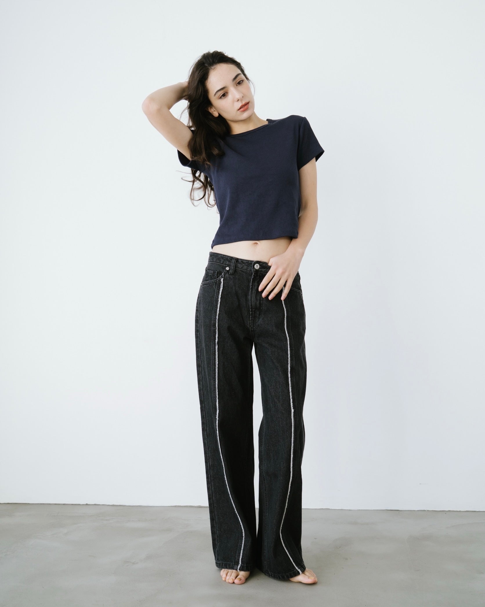 フロントはフリンジの切り替えデザインをプラス定番のデニムとは背別化され腰に落とし、緩く履くのもおすすめのスタイリングです。